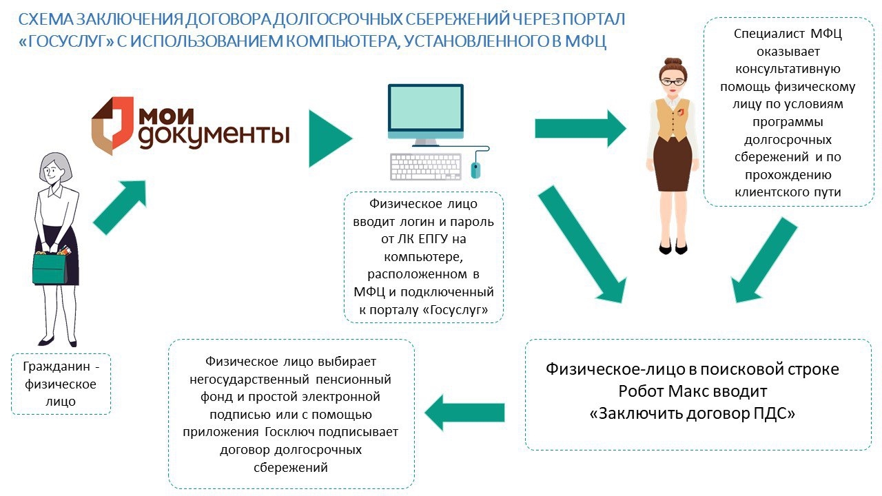 Заключить договор долгосрочных сбережений можно через портал Госуслуг в секторе пользовательского сопровождения МФЦ.